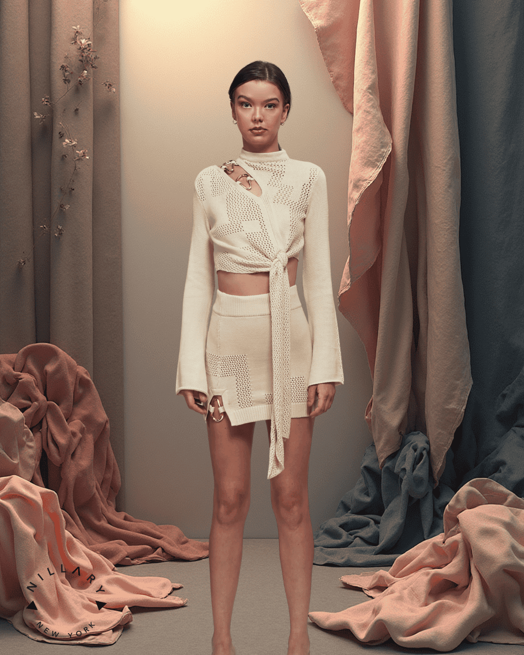 Style: Cut-out shoulder crop top with tie front and flared sleeves + fitted skirt with molded metal detail